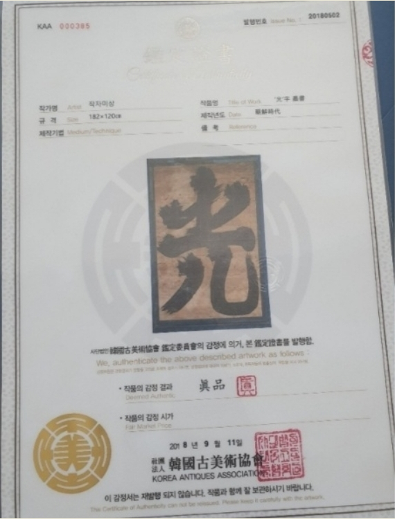 | 특성 및 사양 | [감정1] 1. 감정기관: 한국고문헌연구소 소장 2. 작품명 : 광(光)字 書筆 3.감정책임: 서수*( 010-4272-397* ) 4.감정일 : 2017.12.05일 5.작가명 : 한석봉(韓石峯)(1543~1605) 6.감정결과 : 진품 [감정2] 1. 감정기관 : 사단법인 한국고미술협회 2. 작품명 : 광(光)字 書筆 3. 감정일 : 2018.09.11 4. 작가명 : 작자미상 5. 작품의 감정결과 : 진품(眞品) 6. 크기 (규격) 182 * 120 cm 7. 제작년도 : 조선중기(1543~1605) |