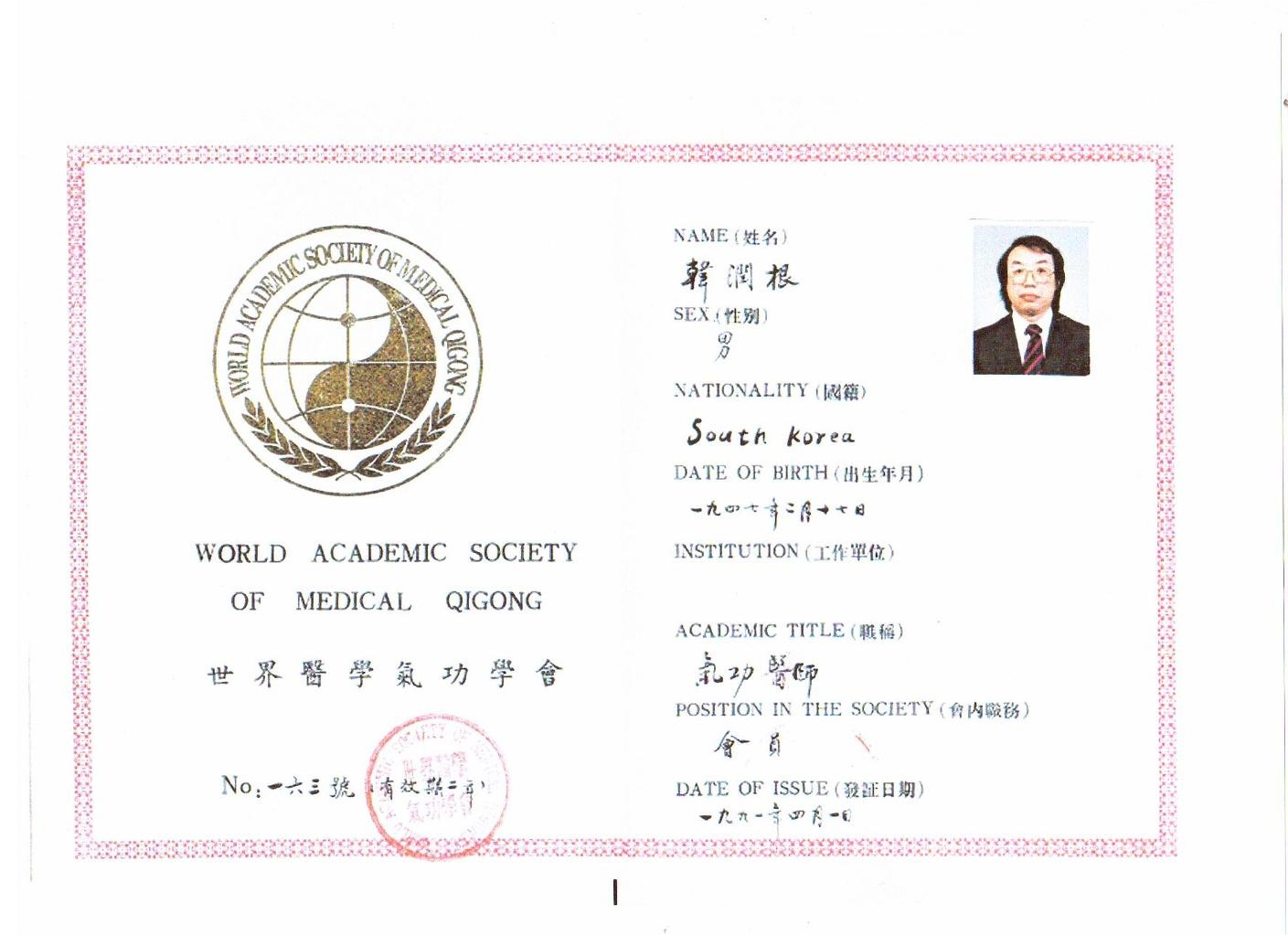 1991년 세계의학기공학회 창립총회에서 한국인최초 기공의사로 등록회원이며 이학회는 북경중의학원내에있는 UN협력학회입니다