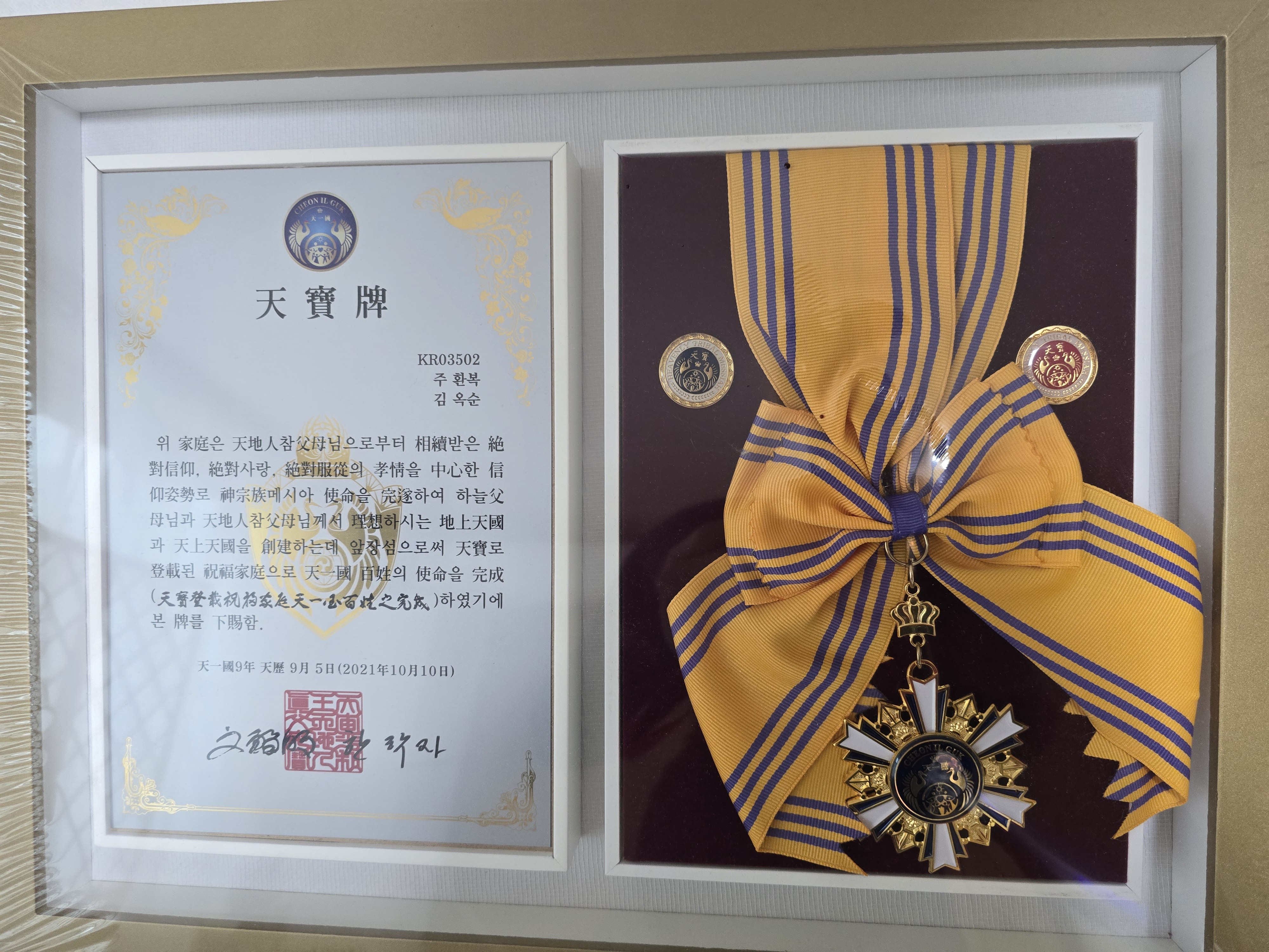 천일국9년9월5일 (2021년10월10일) 번호KR3502로 참부모님께서 하사하신 증패와의복