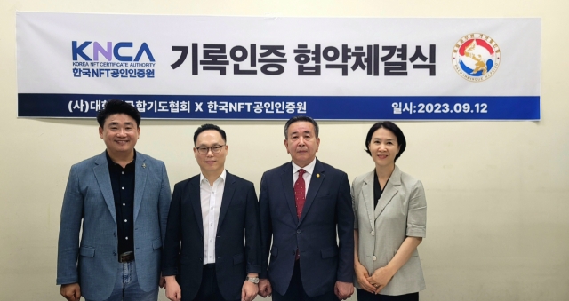 사진 왼쪽부터 강광민 한국NFT공인인증원 부원장, 김승일 한국NFT공인인증원 원장, 정명채 대한민국합기도협회 총재, 오정미 한국NFT공인인증원 본부장.