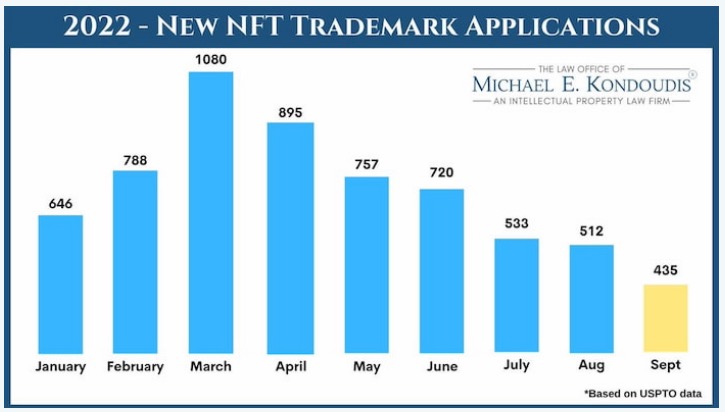 메타버스 및 NFT 상표 전문 변리사 마이클 콘두디스(Michael Kondoudis)가 5일(현지시간) 공개한 데이터에 따르면 지난 1월 1일부터 9월 30일까지 미국 내 NFT 블록체인 관련 상표 출원 건수는 6,366건에 달했다. 이는 지난해 2,142건을 뛰어넘는 수치다. 월 별로는 3월이 1080건으로 가장 많았고, 4월이 895건, 2월과 5월이 각각 788, 757건을 기록했다. 이에 대해 케이티 혼(Katie Haun)의 암호화폐 펀드 혼 벤처스(Haun Venture) 대표는 "올해 2분기 이후 NFT에 대한 관심이 줄어들면서 시장이 얼어붙었지만, NFT 시장이 장기적으로는 수익을 올릴 것"이라고 진단했다.
