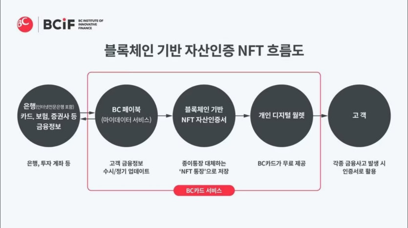 또 앞으로 BC카드 마이데이터 서비스를 통해 모든 계좌정보를 인증 받을 수 있다. 또 이를 NFT화해 언제 어디서든 제공받을 수 있게 된다. 금융사 전산마비시에도 이 NFT를 해당 자산에 대한 인증서로 활용할 수 있다. BC카드는 국내 최고 수준의 블록체인 기술을 보유한 ‘KT’와 전자지불결제를 담당하는 그룹사 ‘브이피(VP)’와의 협업도 진행 예정이다.